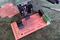 Die 4 Ausgänge sind als 2 Open Collector und 2 Relais ausgeführt. Die Miniaturrelais können bis ca. 30V und 1A Schalten. Die Basisplatine hätte nicht zweiseitig sein müssen, mit Zwei, Drei Brücken wäre es auch eine einseitige Platine werden können. Da mein Platinenvorrat aber fast nur noch aus beidseitig beschichteten Platinen besteht und ich so Controller und Basis in einem Durchlauf fräsen konnte, wurde es eine zweiseitige Platine. |
