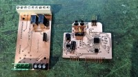 Die 4 Ausgänge sind als 2 Open Collector und 2 Relais ausgeführt. Die Miniaturrelais können bis ca. 30V und 1A Schalten. Die Basisplatine hätte nicht zweiseitig sein müssen, mit Zwei, Drei Brücken wäre es auch eine einseitige Platine werden können. Da mein Platinenvorrat aber fast nur noch aus beidseitig beschichteten Platinen besteht und ich so Controller und Basis in einem Durchlauf fräsen konnte, wurde es eine zweiseitige Platine. |